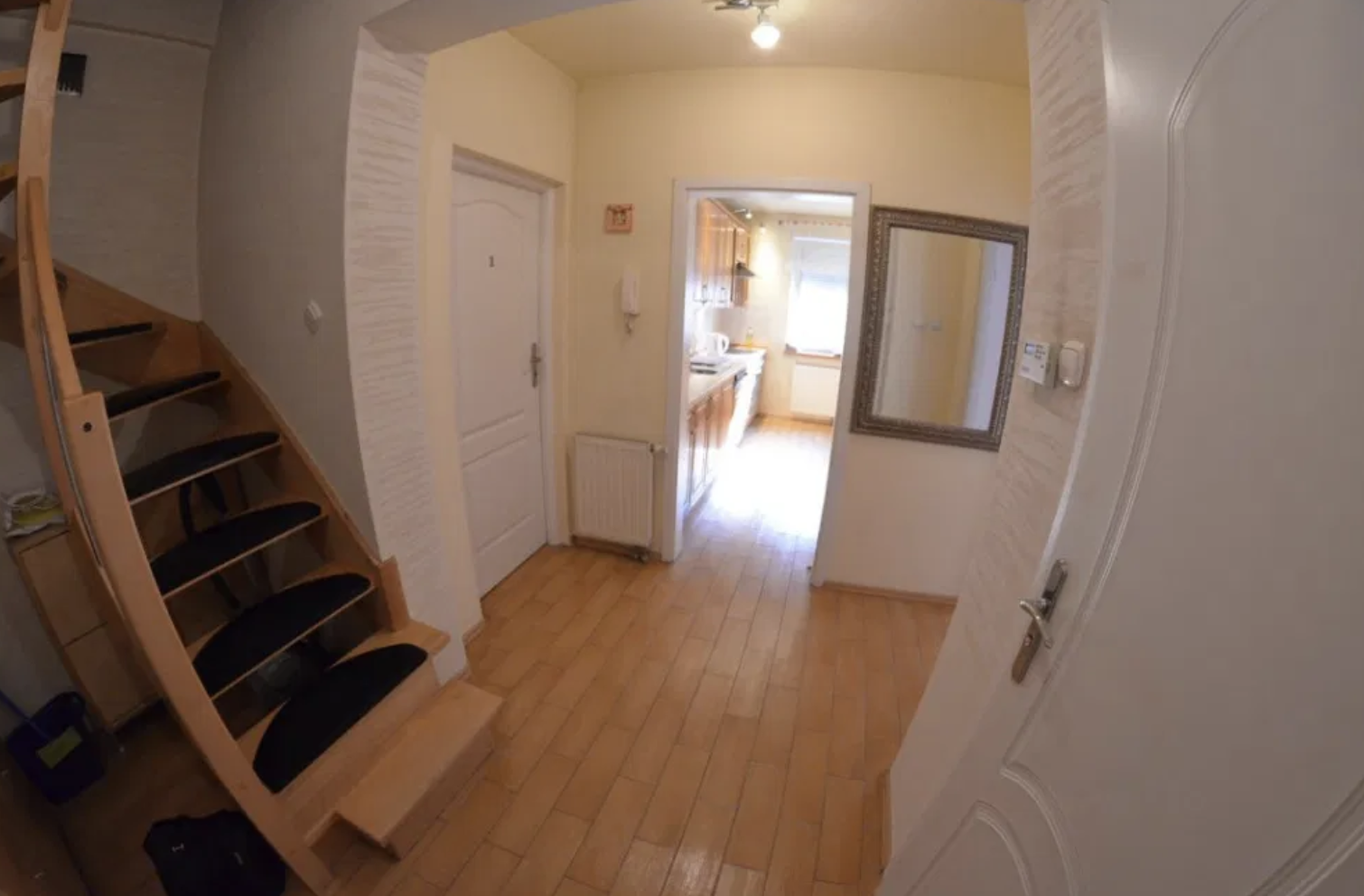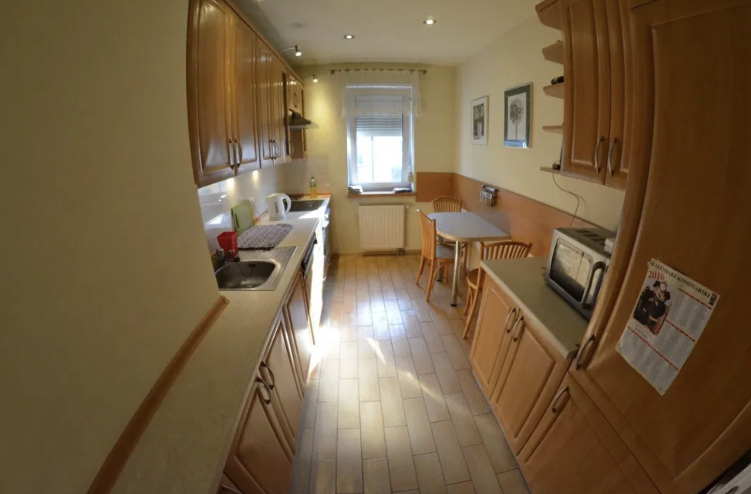 Kuchnia wyposażona w komplet naczyń, sztućców, dla wszystkich mieszkańców. Mieszkanie wyposażone w deskę do prasowania, żelazko, suszarkę do ubrań, odkurzacz i przedmioty do utrzymywania porządku.