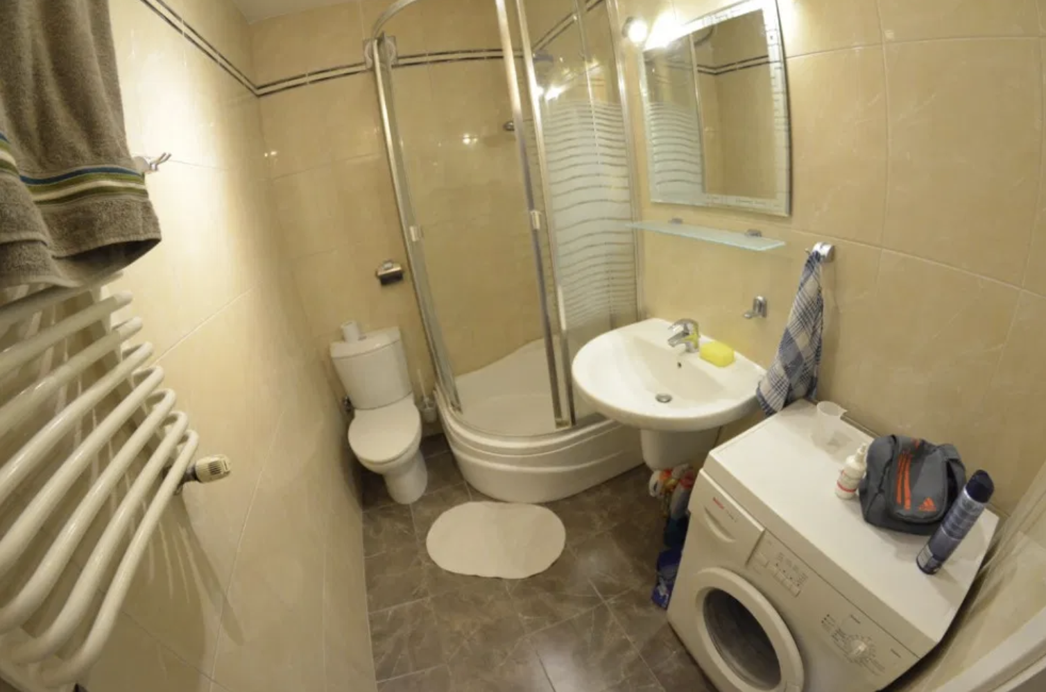 Mieszkanie jest dwupoziomowe i ma dwie pełne łazienki więc na jednym poziomie z łazienki korzystają 4 osoby a na drugim 3.