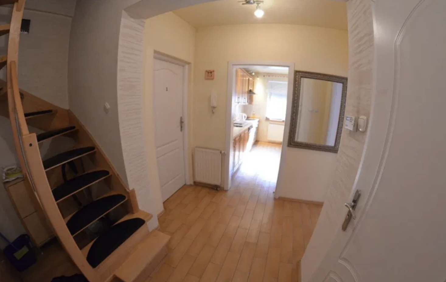 Kuchnia wyposażona w komplet naczyń, sztućców, dla wszystkich mieszkańców. Mieszkanie wyposażone w deskę do prasowania, żelazko, suszarkę do ubrań, odkurzacz i przedmioty do utrzymywania porządku.